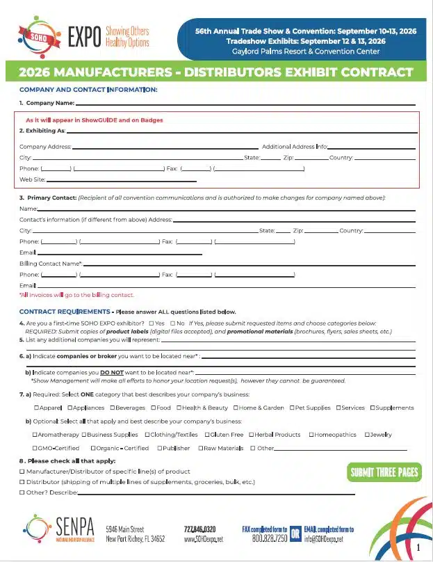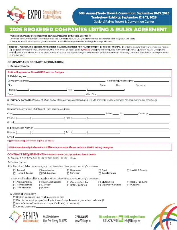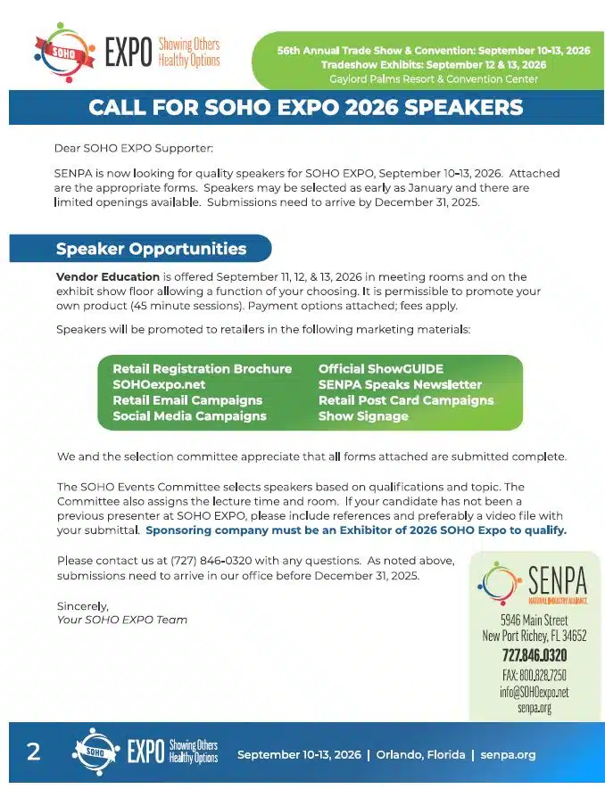 SOHO EXPO is a Natural Products Industry Trade Show and Convention produced since 1971 by SENPA a non-profit Trade Association with proceeds from the show staying within the industry. SOHO EXPO offers the right mix of the natural products industry, and is located at the beautiful Gaylord Palms Resort and Convention Center in Orlando, FL.